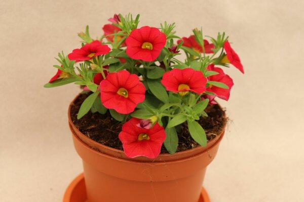 - Calibrachoa 'Aloha Kona Red' von Dümmen Orange überzeugt durch ihre frühe Blüte und kompakte Wuchsform. Bereits sechs Wochen nach der Kultur waren 75 % der Pflanzen in Blüte – ganz ohne Stutzen oder Hemmstoffe.