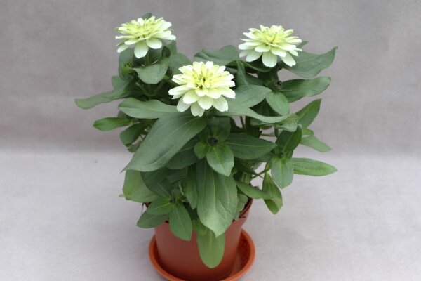 Bei den Salvia der Salgoon-Serie (Hilverda Florist) fiel 'Lake Flamingo' durch kräftigen Wuchs und üppige Blüte auf. Die Sorten eignen sich hervorragend für große Töpfe (z. B. T17) und blühten nach einmaligem Stutzen und Stauchen bereits nach zehn Wochen. Zinnia Profusion Double Type 'White Improved' (Sakata) überzeugte als kompakte und blühfreudige Sorte.