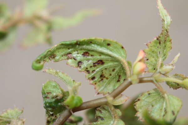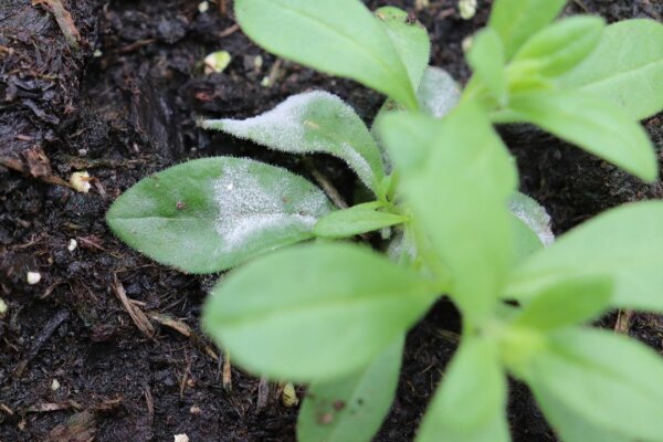 Echter Mehltau war zum Teil ebenfalls schon an den Jungpflanzen vorhanden. Befallene Kulturen, wie z. B. Calibrachoa, Helianthus, Dahlia und Bidens wurden bis zur Verkaufsreife zweimal mit Score behandelt.