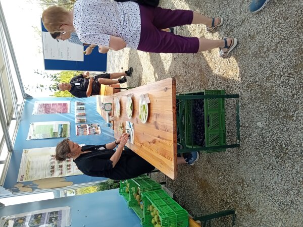 Das Team brachte zum ersten Termin etliche Kisten Äpfel und Zwetschgen mit. Die BesucherInnen der LGS konnten frühe Apfelsorten, wie Barbarossa, Piros, Estelle, Delbarestivale oder Sommernachtstraum, verkosten, und an die Sorte, welche ihnen am besten schmeckte, einen Punkt vergeben. Ebenso verhielt es sich mit den Zwetschgen, wobei hier die Sorten Hanka, Cacaks Schöne, Franzi und Blue Frost probiert werden konnten.