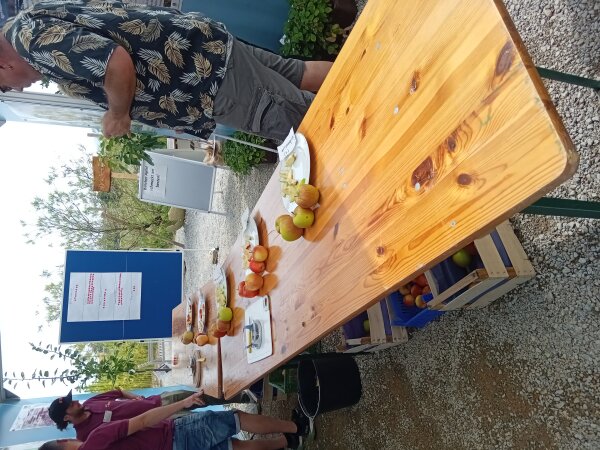 Das Team brachte zum ersten Termin etliche Kisten Äpfel und Zwetschgen mit. Die BesucherInnen der LGS konnten frühe Apfelsorten, wie Barbarossa, Piros, Estelle, Delbarestivale oder Sommernachtstraum, verkosten, und an die Sorte, welche ihnen am besten schmeckte, einen Punkt vergeben. Ebenso verhielt es sich mit den Zwetschgen, wobei hier die Sorten Hanka, Cacaks Schöne, Franzi und Blue Frost probiert werden konnten.